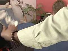 Attraktive Masseurin Silvia Saige gibt glücklicher Mann einen guten footjob in Salon