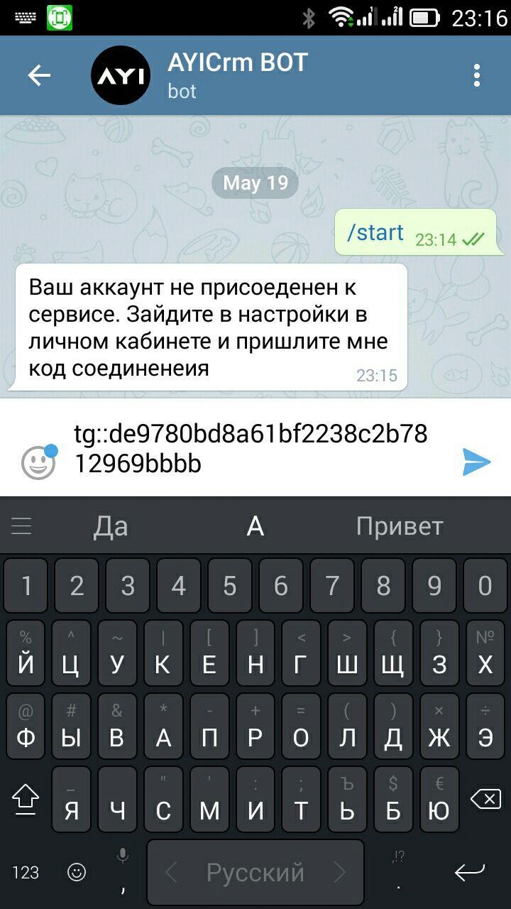 Переходим в телеграмм и копируем присланный код нашему боту @AYICrm_bot
