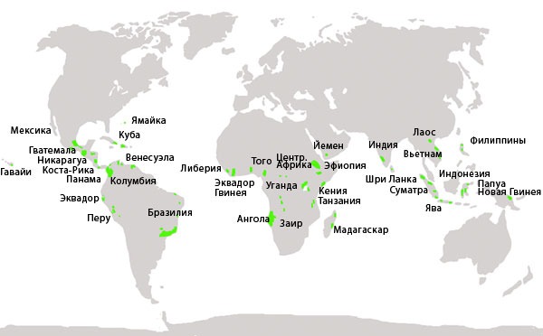 Для выращивания кофейных деревьев пригодны климатические условия 80 стран мира , однако в промышленных масштабах его производят лишь 50 из них. К мировым лидерам можно отнести всего 6 стран (Бразилия, Колумбия, Вьетнам, Эфиопия, Индия и Индонезия).