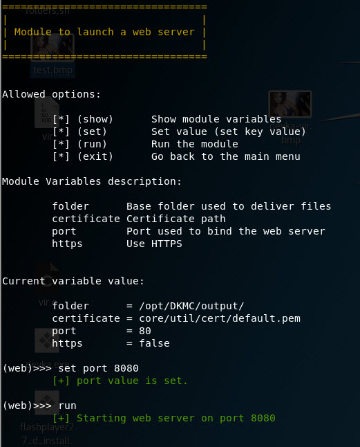 Далее, нам необходимо запустить веб-сервер, с которого жертва будет скачивать вирусную картинку. Возвращаемся в главное меню и заходим в раздел web.