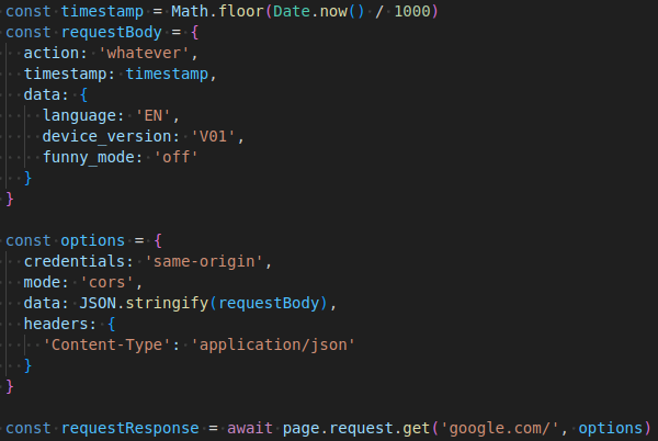 Задля кращої читабельності коду, компонувати body та options запиту краще за межами його виклику — в окремих читабельних константах. Наприклад, окремо прописати body за відповідними вимогами вашого API, а потім передати його в options разом з хедерами та іншими параметрами завдяки JSON.stringify():