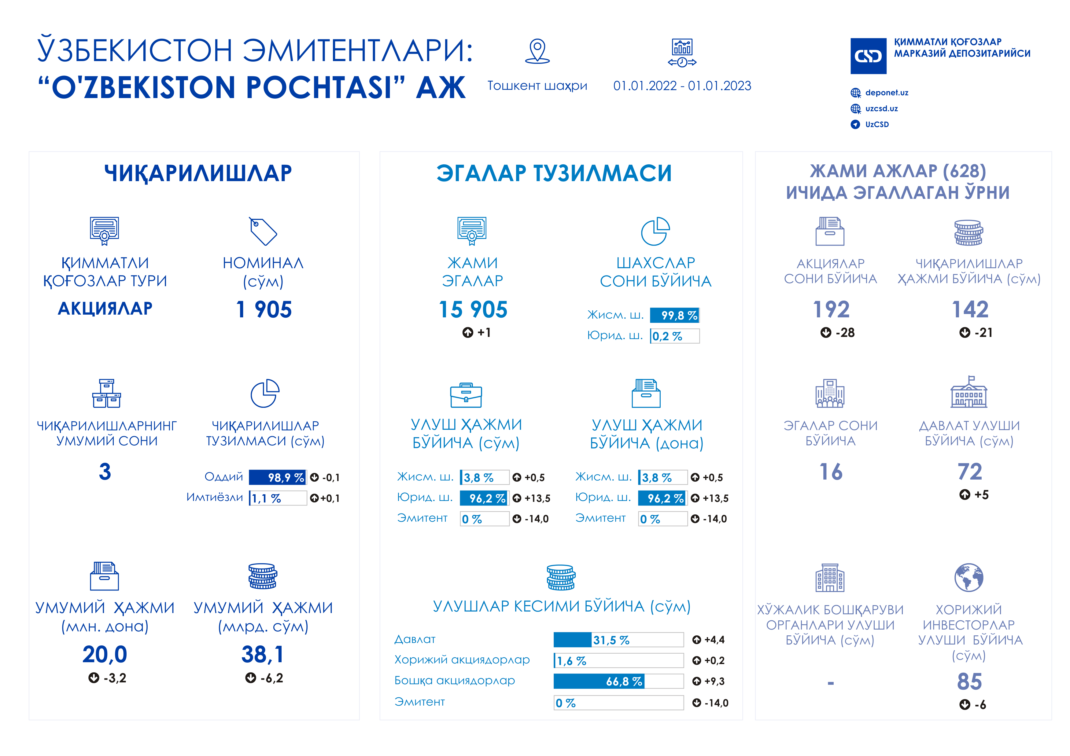 ▶️ жами АЖлар ичида «O'ZBEKISTON POCHTASI» АЖ давлат улуши бўйича 72-ўринни эгаллаб, 5-қатор юқорига кўтарилди.