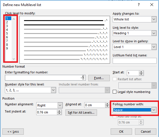 ۳- ابتدا از سمت چپِ پنحره، سطح خود را انتخاب کنید. بهصورت پیشفرض قسمت follow numbering with نوع فاصله برروی tab character است. آن را به space تغییر دهید.