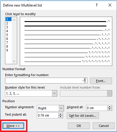 ۲- اگر از تیترها و Headningها و شمارهگذاری چندسطحی (multi level numbering) استفاده کرده باشید، پنجرهای شبیه این پنجره باز خواهد شد. از پنجرهٔ بازشده، گزینه more را انتخاب کنید.