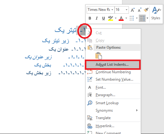 ۱- روی شماره اتوماتیک خود، راستکلیک کنید و گزینه adjust list indent را انتخاب کنید.
