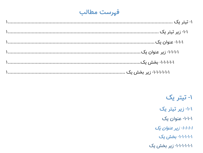 حالت اول: شما از تیترها (Headning) و شمارهگذاری چندسطحی (multi level numbering) استفاده کرده باشید.