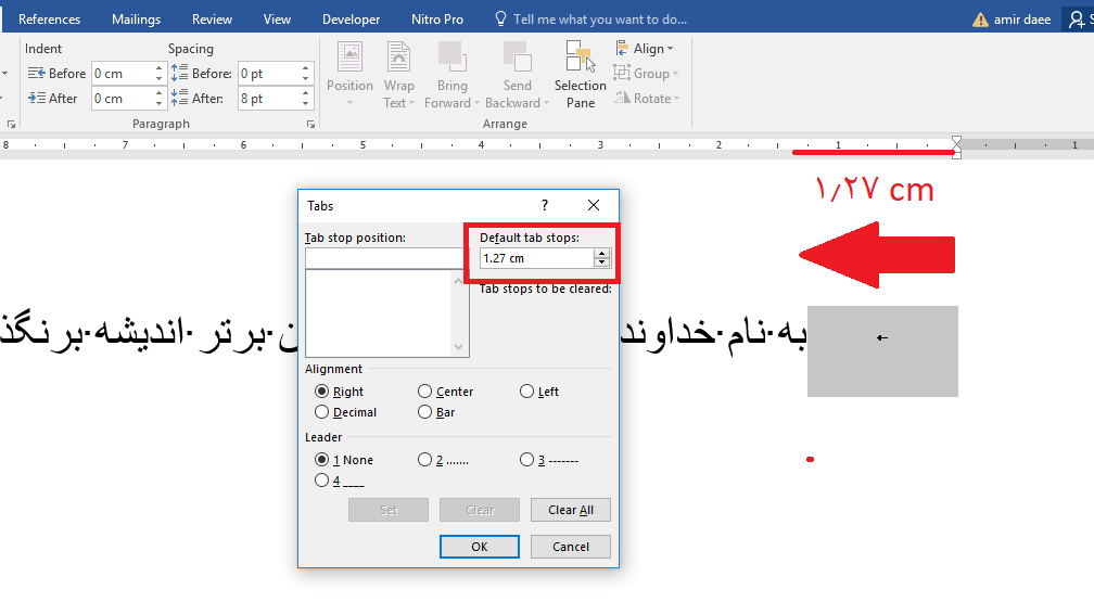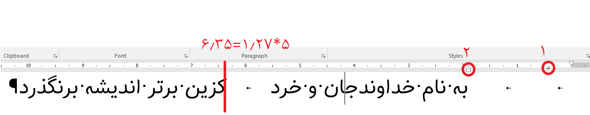 تا اینجای کار متوجه شدید که در حالت پیشفرض، نوع فاصله بین شماره اتوماتیک و متن در ورد از نوع tab character است، و بهصورت پیشفرض هر tab در ورد فاصلهای ۱٫۲۷cm را ایجاد میکند. یعنی خط شما را به فاصلههای ۱٫۲۷cm تقسیم میکند و هر tab از ابتدای این فاصلهها شروع میشود. اگر شما ۲ عدد tab قبل از متن خود بزنید از ابتدای صفحه ۲*۱٫۲۷ فاصله ایجاد میشود.