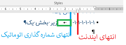 بهصورت پیشفرض فاصلهٔ بین شماره اتوماتیک و متن از نوع tab است. برای حل این مشکل کافی است نوع فاصله بین شماره اتوماتیک و متن را از نوع space تعریف کنید.