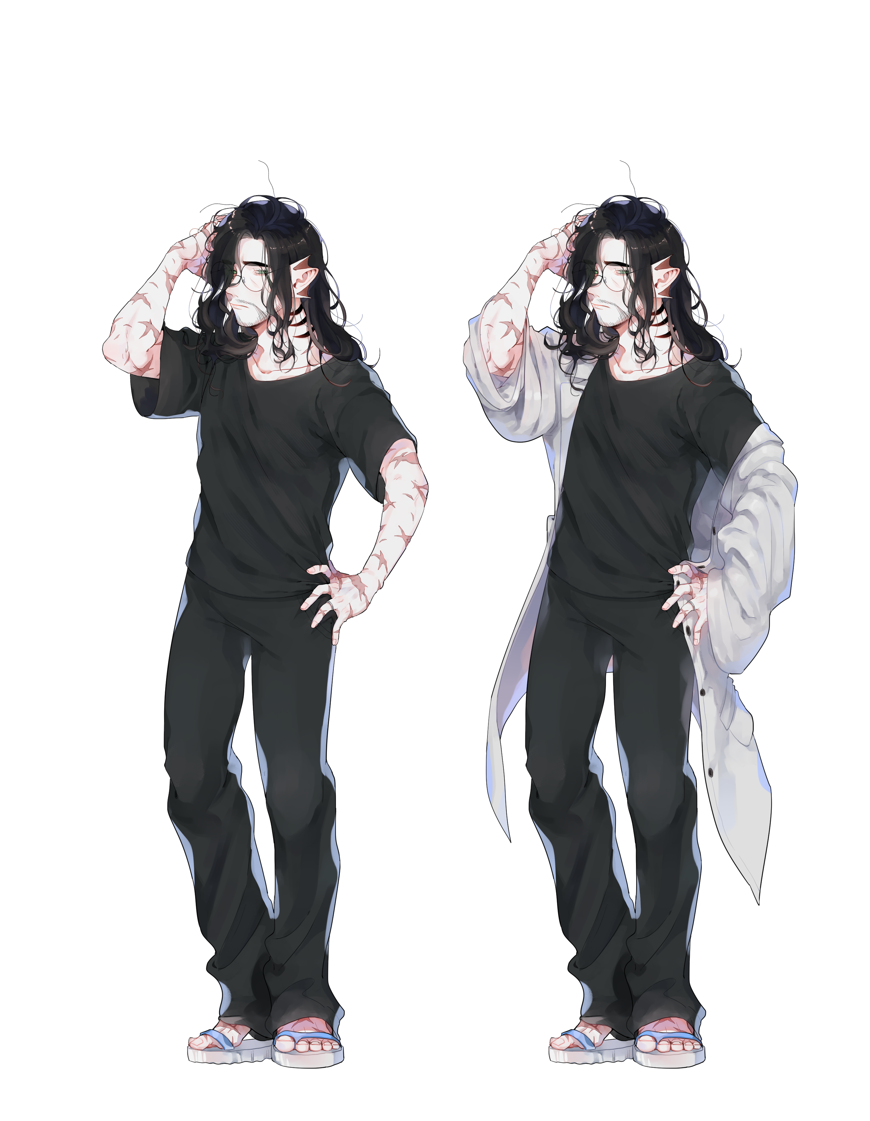 看診時會穿白大褂、黑色手術服和過長的長褲,平時穿著素T和短褲,異常熱愛花襯衫,夾腳拖常駐。