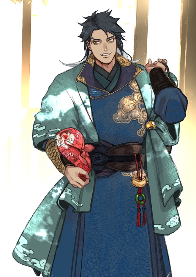 來者劍眉星目、半頭華髮,無簪無冠任由披散,卻透著股墨客的瀟灑氣。裹一身刺著流雲圖騰的銹銅色大袍,肩背著看起來空癟癟的麻布袋子,另一手還揣個紅花錦盤著的裹布。