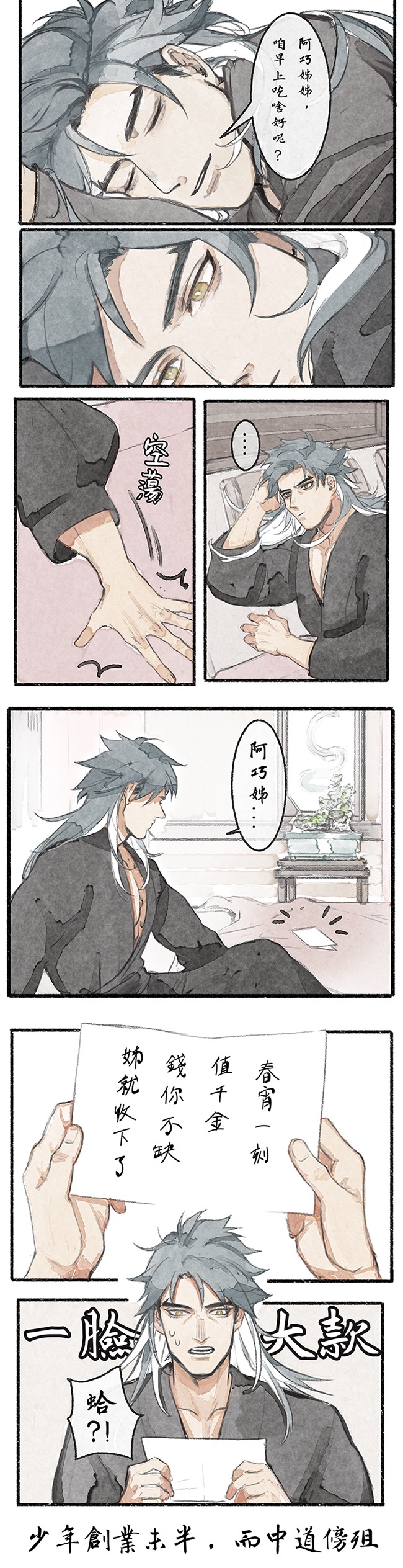 他雖能書善畫,卻沒想到以前時常掛在嘴上的玩笑話可能就要一語成讖,不免有些可悲可笑。