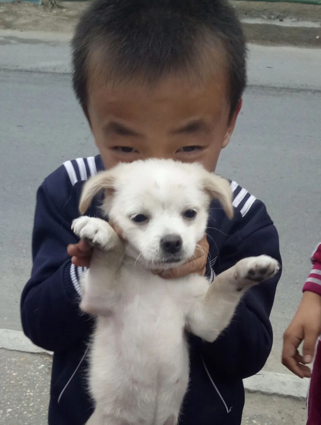 天气很好的一天,我在宿舍附近的小学旁看到一个朝鲜男孩抱着一只白狗,男孩和白狗都很小。当时我没有意识到,这是我第一次在朝鲜见到类似“宠物”的动物。我跟他说,我想和他拍一张照片。这时,突然从旁边围过来一群朝鲜孩子,他们都想要拍照。于是我建议拍一张合照。拍照时,我伸出两根手指,比出了“耶”的手势,孩子们很惊奇,问我,这个手势是什么意思?