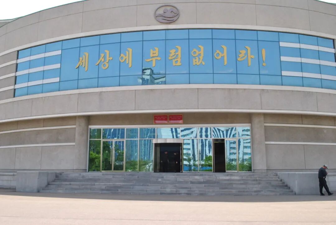 在学校的安排下,我们还去了锦绣山太阳宫、毛岸英纪念碑,参观了各种博物馆。在万景台学生少年宫里,我看到了比电影中更多的兴趣爱好教育活动。少年宫是专门供孩子们免费上兴趣班的场所,朝鲜小孩长到一定岁数后,可以选择自己想上的兴趣班,有书法,跳舞,唱歌,写作,刺绣,伽倻琴等。万景台学生少年宫很大,大楼上竖立着两行红字标语,一行是“不羡慕世界上任何一个国家”,另一行是“团结一致向未来前进”,中间是将军的肖像。