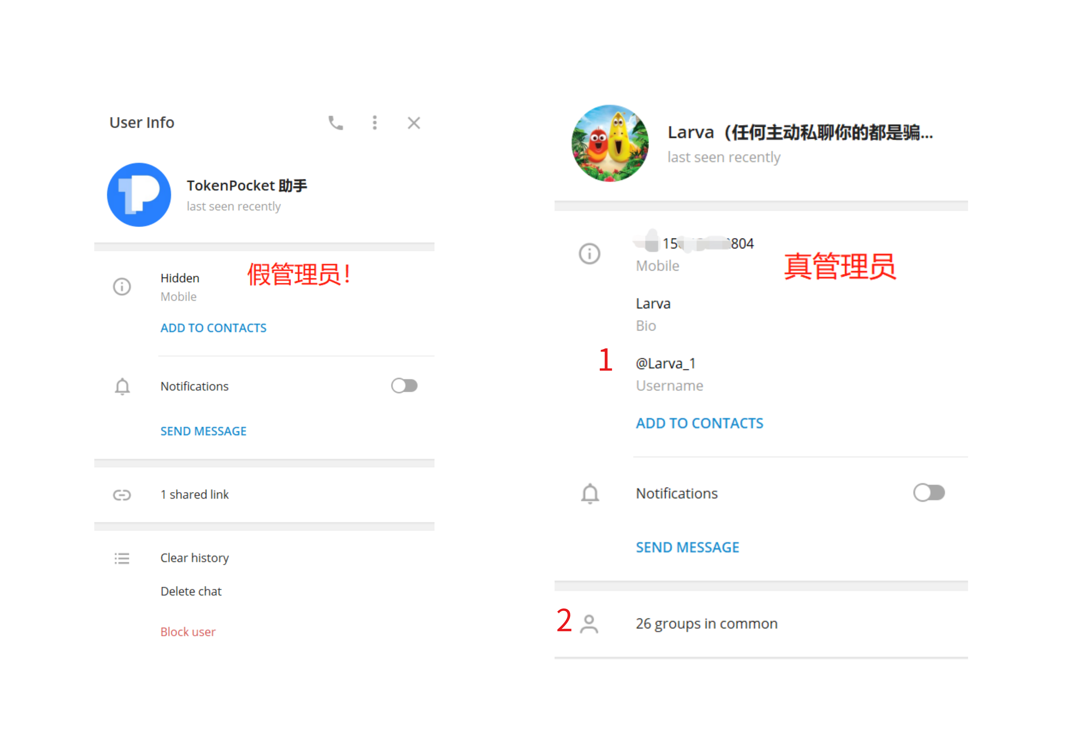 - 我们目前群管理员都是会带有“Username”用户名,Username是账号的唯一标识,大部分假管理员不会带有Username,或者,带有跟管理员及其类似的用户名,比如以下真管理的用户名为“@Larva_1”,假管理很有可能会把用户名改成“@Larva_l”,乍一看好像没有什么区别,仔细观察才发现原来是把数字“1”换成了英文字母小写“l”