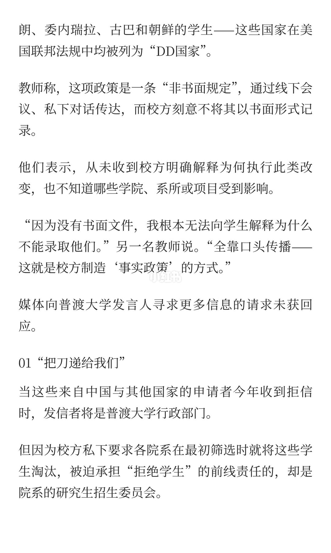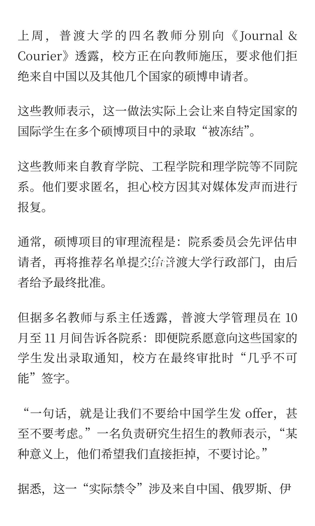 发布于“小红书一瞥”频道(点击进入)上周,普渡大学被曝要求教师拒绝来自中国及部分国家的硕博申请者,尽管院系愿意录取,校方在审批时几乎不可能签字。教师称,这一政策通过口头传达,缺乏书面记录,导致院系面临两难,被迫拒绝优秀学生。