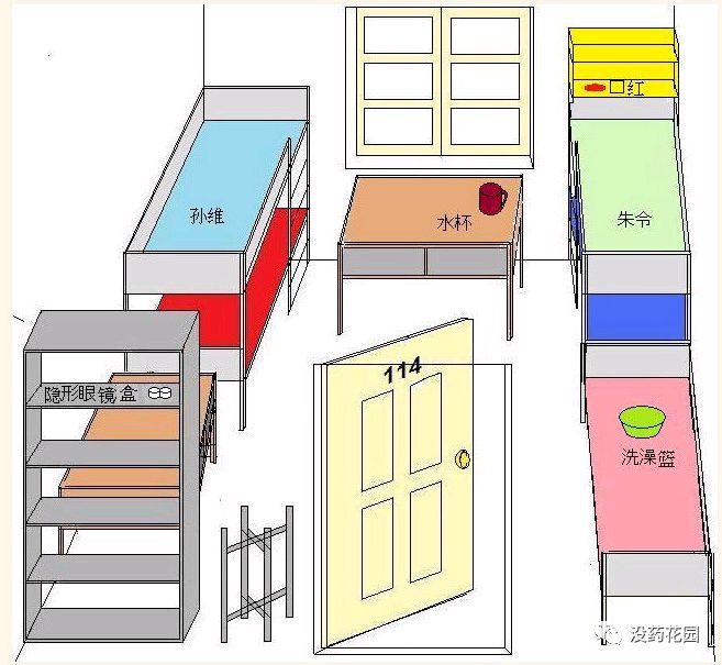 这间寝室靠窗的位置摆放着一张桌子,朱令有时会把她的水杯放在桌上;进门右手的长桌上摆放着寝室里4位姐妹使用的洗澡篮;朱令的隐形眼镜小盒则放在进门左手的公用架子的最上方。”(《朱令和她的三个室友》载于《博客天下》2013年6月5日)