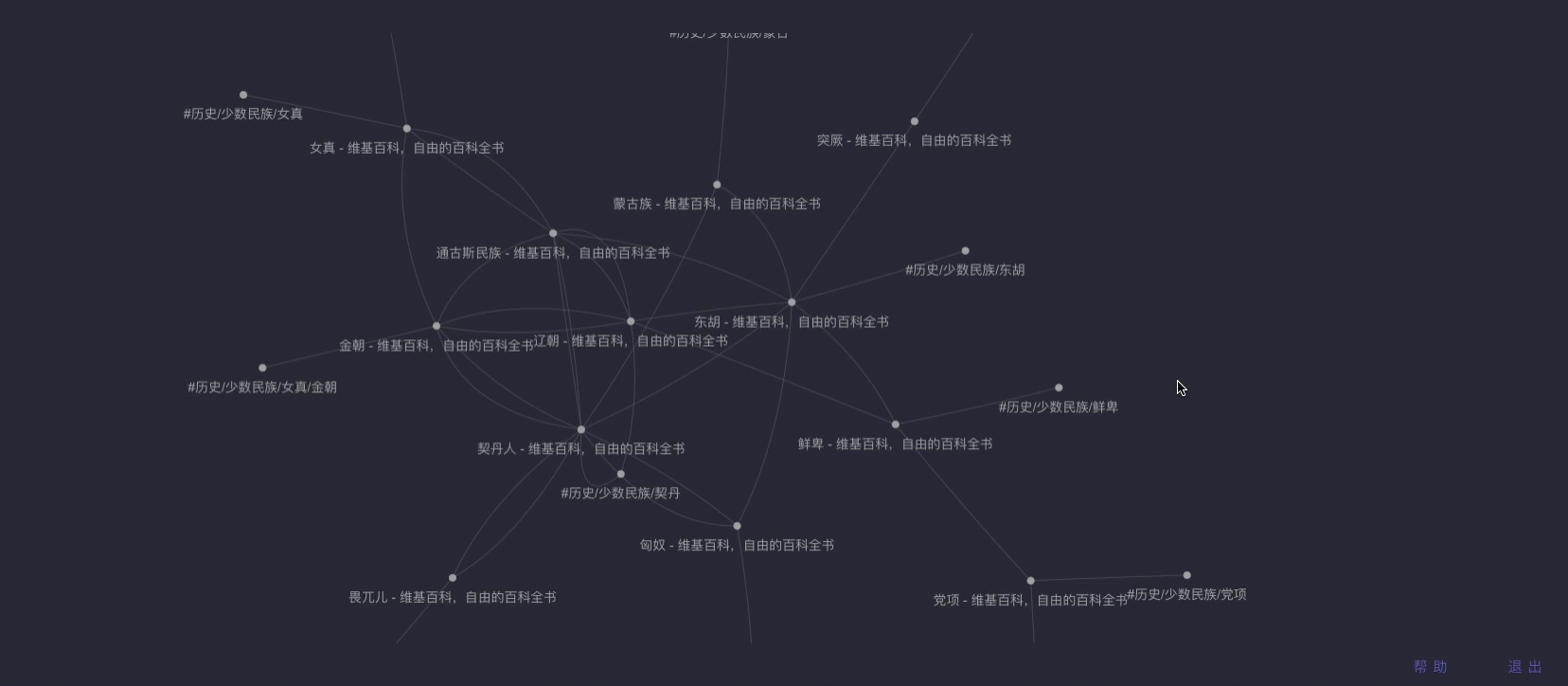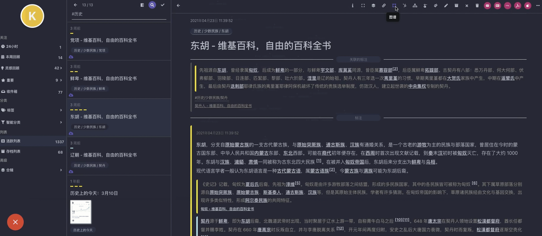 比如,我想调查下历史上的北方少数民族,通过维基百科查到了一些有用的信息,并将它们简单加入到稍后读工具中。在通过 双向链接 方式生成了上面这个图谱,当鼠标随便指向某个信息点后,就会产生于此关联的信息,从而通过这些关联更深入的了解你需要的信息。