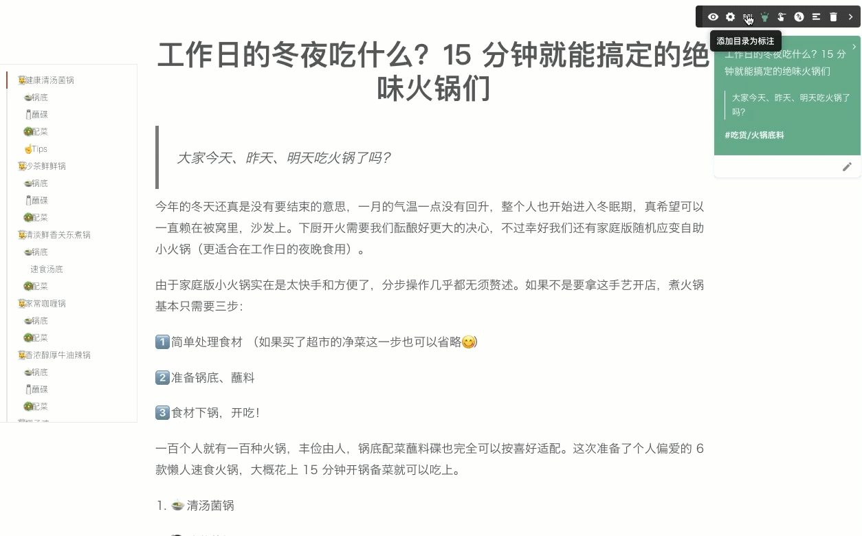 某些情况下,只需要标注对应的标题即可。作为吃货的我,经常在我派这里遇到好吃的内容,如: 工作日的冬夜吃什么? 我只是想收藏一些好吃的火锅名称而已,这时候就可以以使用此功能了。