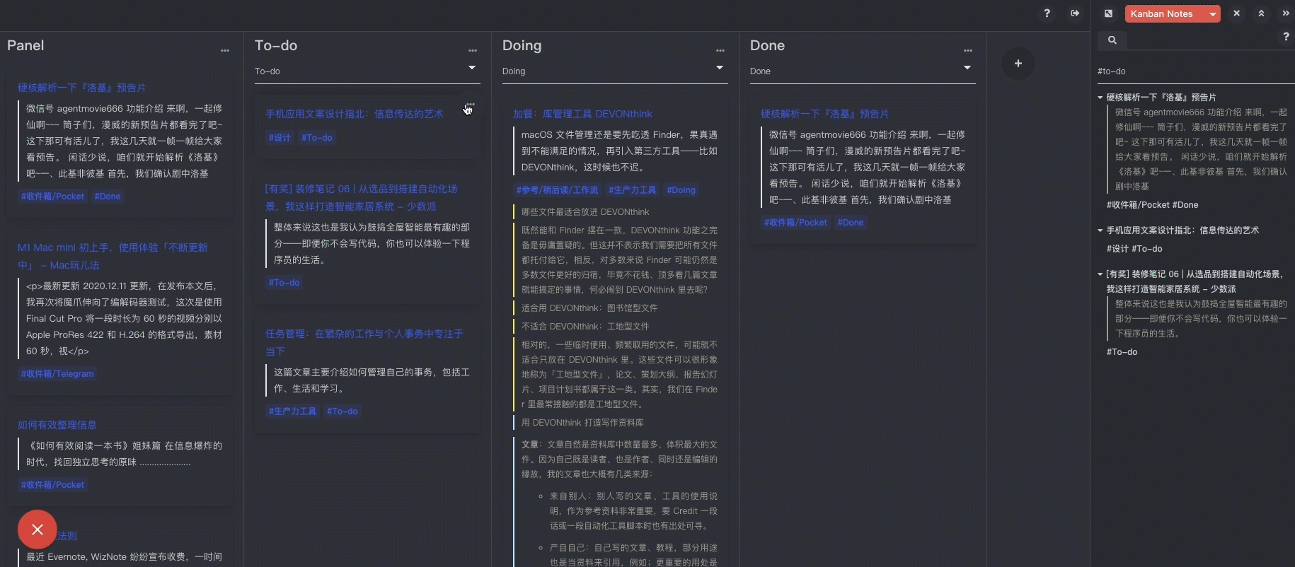 通过设置一些 Todo / Doing / Done 之类的标签,利用 Kanban 布局定期整理你的稍后读信息体系。