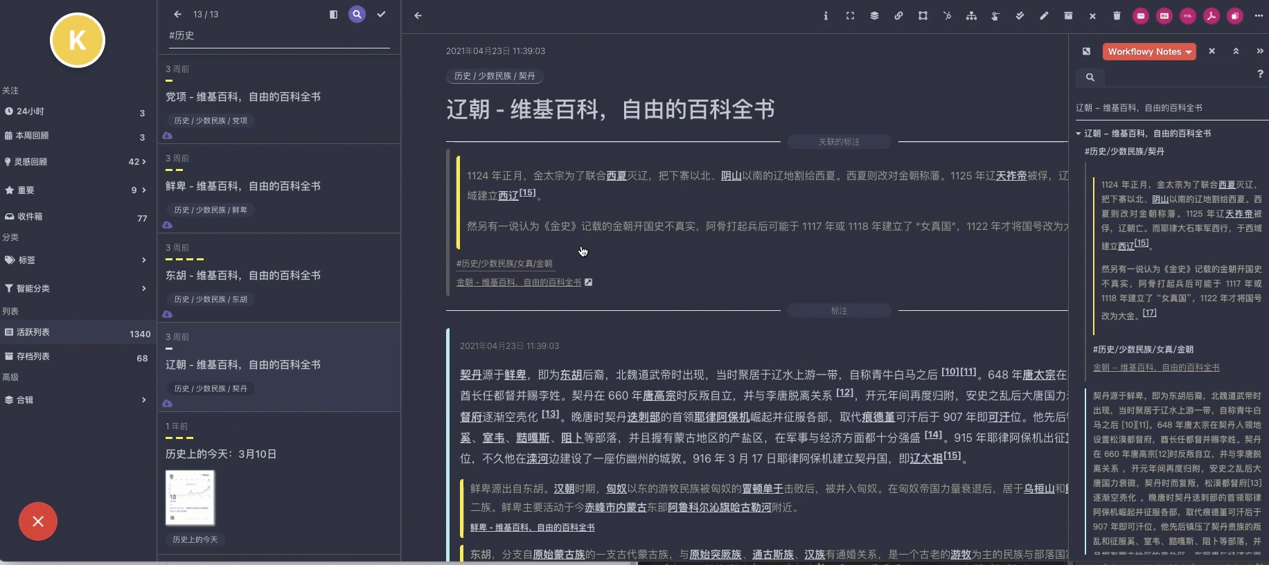 Workflowy 可以将任意稍后读整理到一页,不区分标签 / 时间等分类方式,比知网的汇编功能更灵活。