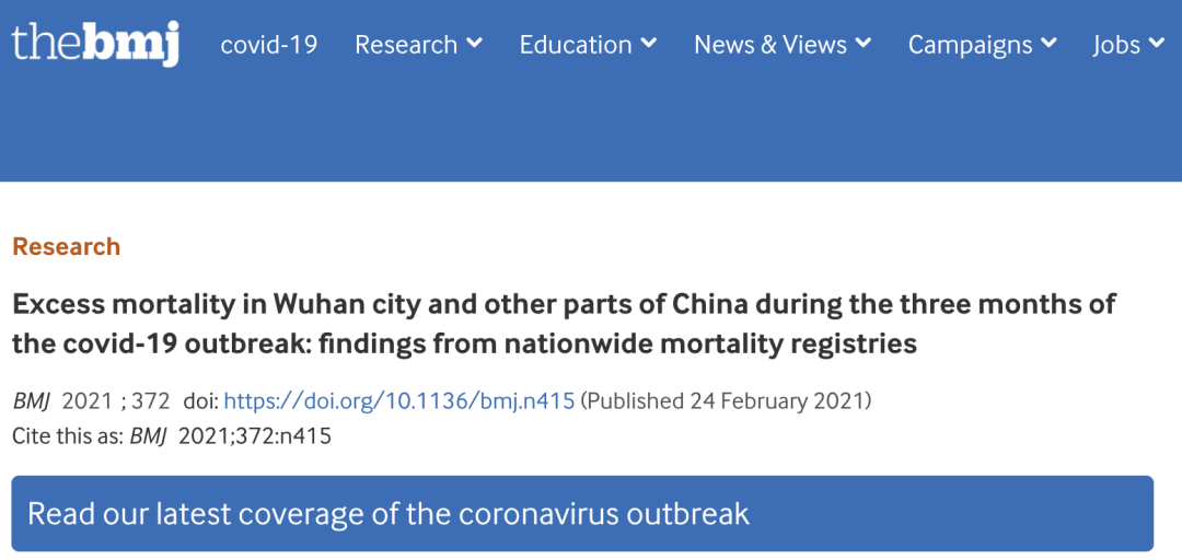 2021 年 2 月,BMJ 发表一篇来自中国疾控中心周脉耕团队的研究,分析了新冠疫情暴发的 3 个月内武汉及中国其他地区的额外死亡率(Excess mortality in Wuhan city and other parts of China during the three months of the covid-19 outbreak: findings from nationwide mortality registries)。