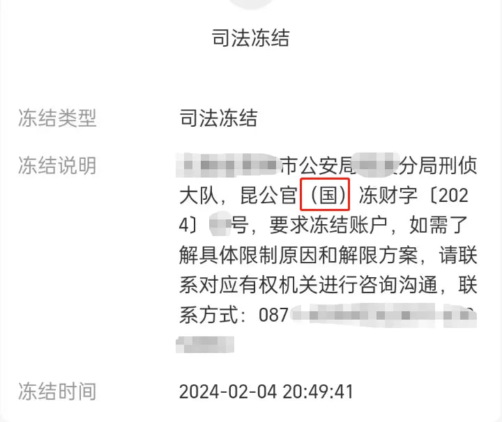 这些文书编号和字是什么意思呢? 文书编号里有:(治),一般是治安大队,这种你可以理解为现场抓赌的,网络上一般是平台数据库被叔叔端掉了,然后拉了所有清单,而你所有的提现款项均是涉赌资金,是非法资金需要追缴的。 而(刑)字这种,就是刑事案件,就是你的账户进入了涉诈资金,从而对你的账户进行侦查冻结。 这种冻结文书的两个字,前面一个是分局的意思,而括号里面的是派出所名称,所以很好分辨,也方便你自己了解到底是哪个有权机关冻结了你的账户。