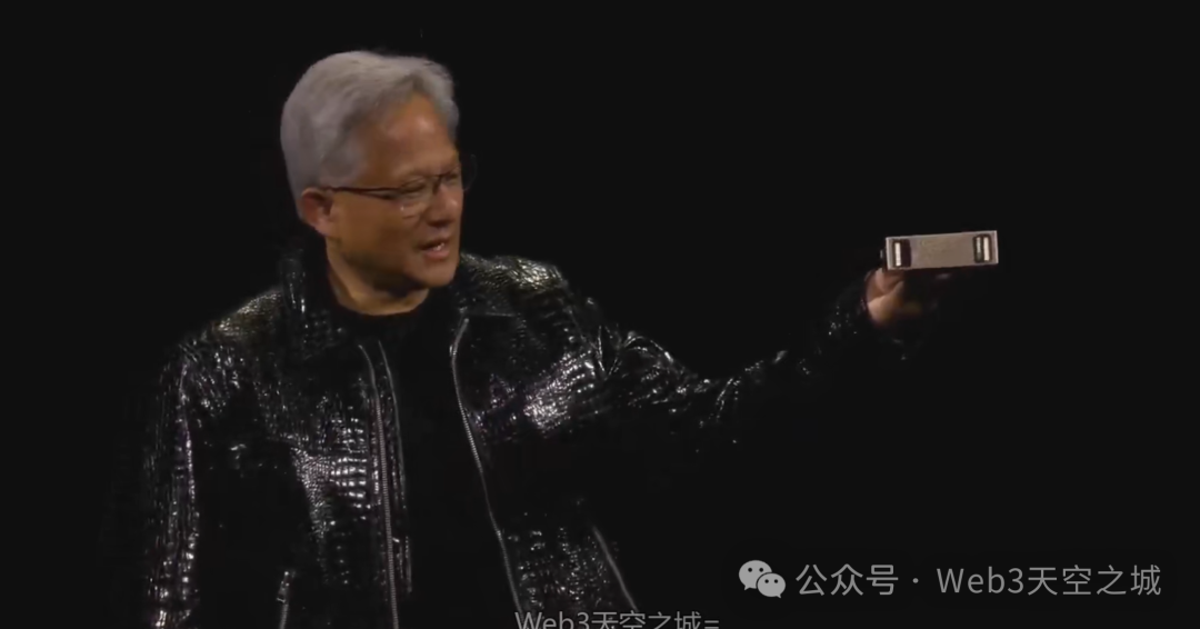 现在,所有这一切的目标就是为了创造一个巨大的芯片。我们需要的计算量确实非常惊人。这基本上就是一个巨大的芯片。如果我们不得不去制造一个芯片……对不起,各位。你们看到了吗?太酷了。看看这个,这里有迪斯科灯。如果我们必须把它做成一个芯片,很显然,它会有晶圆那么大,但这还不包括良率的影响,它可能需要三到四倍那么大。但我们这里基本上有72个Blackwell GPU或144个芯片。这个芯片的算力是1.4exaflops。世界上最大、最快的超级计算机,直到最近才……整个房间的这台超级计算机直到最近才达到1艾弗洛普以上。这是1.4exa flops的AI浮点运算性能。