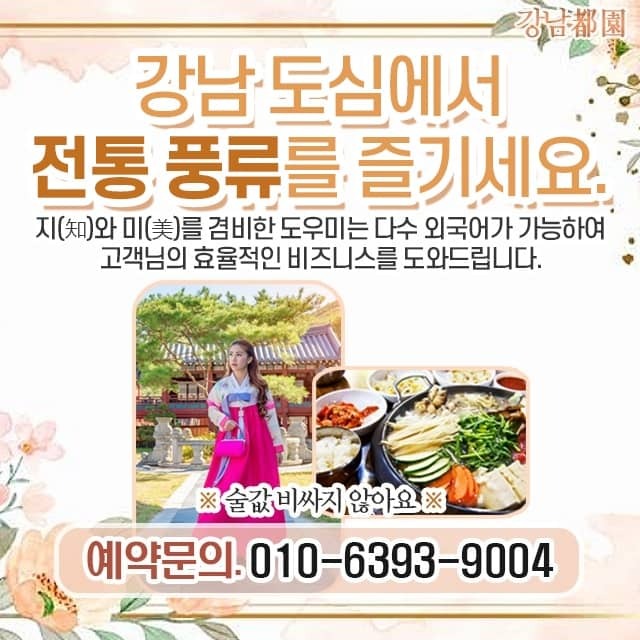 강남도원요정 한국 전통의 가락이 울려 퍼지니 듣기 좋은 곳이랍니다.