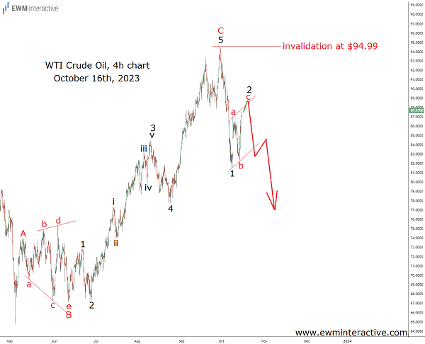 Нефть явно находилась в нисходящем тренде до восстановления до уровня почти $95 за баррель в конце сентября. Это обстоятельство, а также резкость последовавшего за ним медвежьего разворота заставило нас ожидать еще большую слабость в будущем. Ралли, последовавшее за началом войны между Хамасом и Израилем, выглядело не более чем незначительным коррекционным движением в рамках второй волны. Если приведенный выше подсчет был верен, то нисходящий долгосрочный тренд должен был возобновиться сразу после его завершения. Что произошло дальше, мы все знаем, но все равно давайте посмотрим.