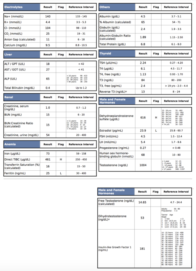 Альфа-гидроксибутират повышен из-за кетогенной диеты. Это хорошо. Ферритин понижен благодаря тому, что я хорошо питаюсь и часто сдаю кровь для тестов. Это очень важный показатель, особенно для мужчин. Согласно некоторым гипотезам, женщины живут дольше отчасти из-за пониженного содержания железа вследствие регулярной менструации.