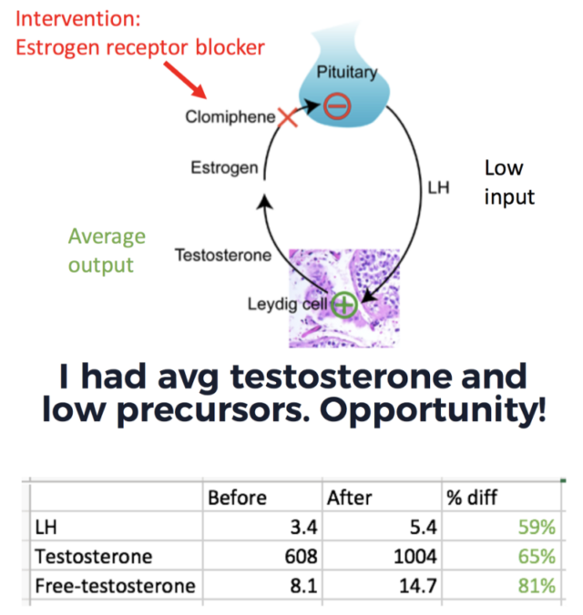 О тестостероне стоит поговорить отдельно. Если вкратце, его уровень у меня средненький, LH/FSH мало — а они инициируют выработку тестостерона. Синтез FSH/LH в свою очередь снижается эстрогеном, который попадает в питуитарную железу. А эстроген — это продукт переработки тестостерона. Так и работает этот «фидбек-цикл».