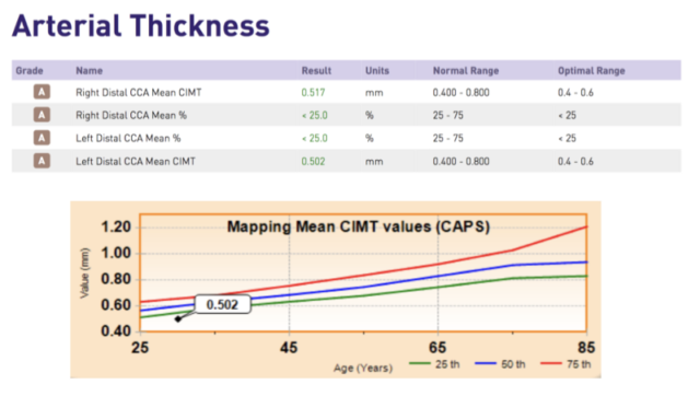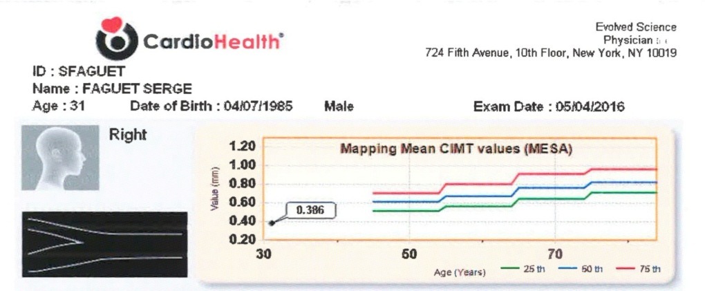 Выше изображены два результата тестов CIMT. Они показывают толщину шейных артерий (чем толще, тем хуже) и намного заранее предупреждают кардиориски. Ещё один фактор, доказывающий, что мой стиль жизни работает.