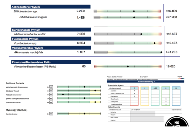 Выше показаны результаты теста GI Effects от Genova Diagnostics. В нём изучается кал на предмет бактерий, паразитов, метаболитов и других интересных вещей (очень веселое занятие отсылать эти анализы через FedEx).
