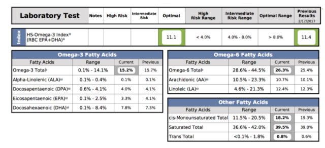В целом у меня высокий уровень EPA/DHA (Omega 3) и низкий уровень Omega 6-жиров и трансжиров. Это результат отличной диеты и приёма добавок. Именно к таким показателям стоит стремиться.