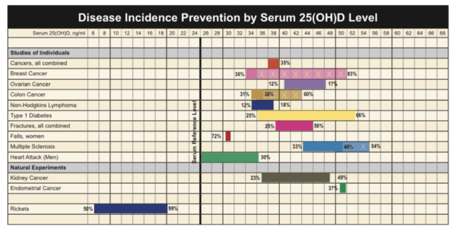 На изображении выше показаны данные, собранные в ходе ряда исследований. Они показывают, что относительно высокий уровень содержания витамина D в крови помогает защититься от множества заболеваний. Крайне маловероятно, что у вас получится достичь этого естественным путём, разве что вы работаете спасателем на израильском пляже и каждый день проводите много часов на солнце.