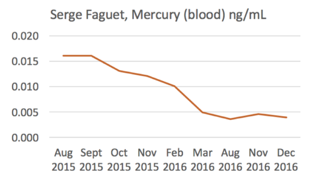 По графику выше видно, что раньше у меня был повышенный уровень содержания ртути в крови и я от него избавился. Гипотетически это было связано с дентальной амальгамой, которую мне когда-то неразумно сделали. Я решил проблему: перестал есть рыбу с высоким содержанием ртути и улучшил работу печени с помощью Б-витаминов и других добавок.