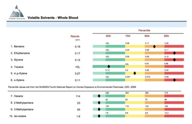 Вот ещё один интересный тест (Genova Diagnostic Toxic Effects), который показывает, что я где-то попал на вредные летучие органические соединения (бензол, стирол, толуол и другая дрянь, которая содержится в пластиках и выхлопных газах). В итоге я улучшил вентиляцию дома и в офисе, перестал есть и пить из пластиковых контейнеров и ещё больше стараюсь не находиться рядом с курящими людьми.