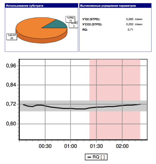 Теперь чуть больше об инсулине и глюкозе. Большой график — это результат теста под названием RQ, который показывает, сколько кислорода и углекислого газа проходит через лёгкие человека в состоянии покоя. Нужно просто надеть газоанализатор и сидеть спокойно.