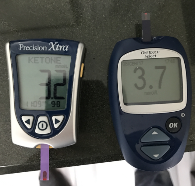 Если интересуетесь кетогенными диетами, то тут всё просто: кетоны измеряются с помощью глюкометров и кетометров вроде тех, что на картинке выше. Важно: полоски для кетометра дорогие. А чтобы достичь уровня кетоза, как у меня выше, нужно будет потратить много сил и времени.