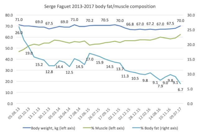 Думаю, абсолютные значения немного врут, а биоимпеданс/DEXA показывает, что я нахожусь где-то между 10% и 11%, а не на уровне 7%. Однако общий тренд прослеживается, и он хорош. К тому же круто, что я практически не похудел: значит, вместо жира я наращиваю мышцы, а это очень полезно для здоровья. Более детально это описано в книге Body by Science: A Research Based Program to Get the Results You Want in 12 Minutes a Week.
