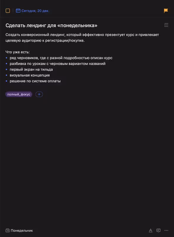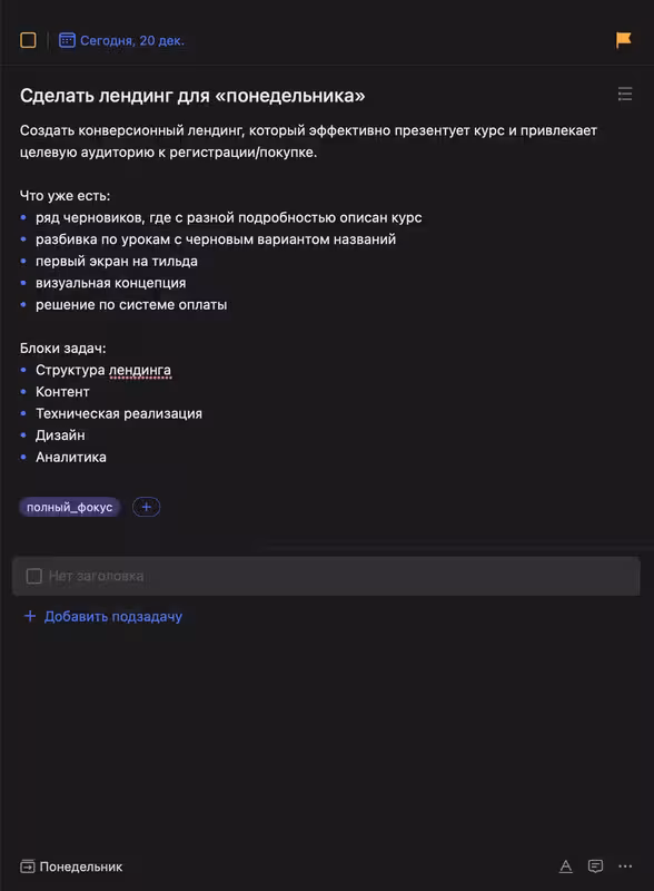 Далее каждый из этих блоков разбивается на более мелкие шаги: например, в контенте — написать тексты о курсе, подготовить оффер, собрать отзывы. В дизайне — выбрать цветовую гамму, подобрать визуальные элементы, адаптировать под мобильные устройства. В итоге вы получаете понятный план, по которому можно уверенно двигаться вперед, не теряя фокус и не застревая на неопределенностях.