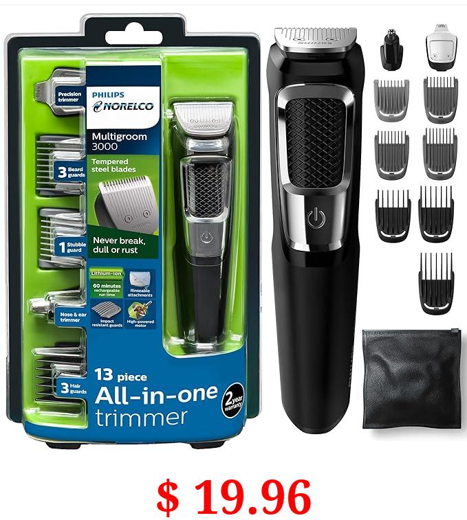 $ 19.96 Philips Norelco Multigroomer All-in-One Trimmer Series 3000, 13 Piece Mens Grooming Kit, for Beard, Face, Nose, and Ear Hair Trimmer and Hair Clipper, NO Blade Oil Needed, MG3750/60