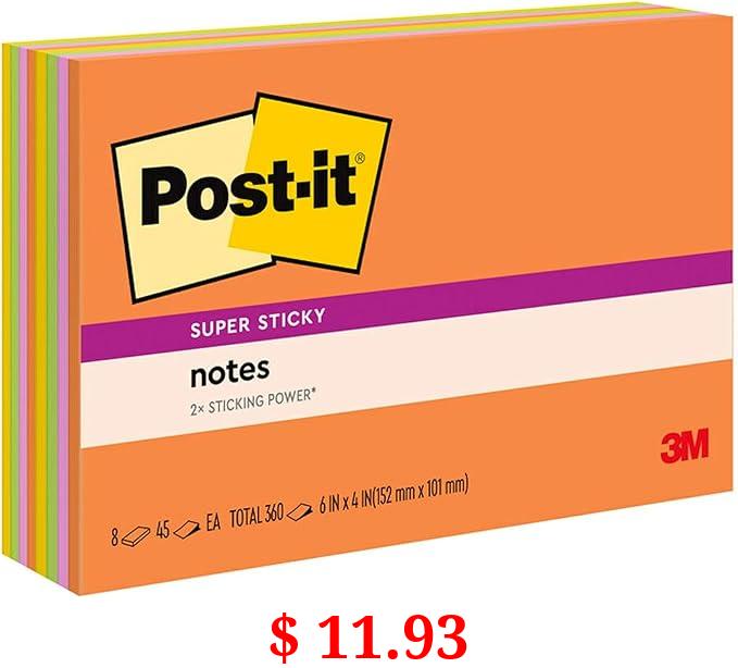 $ 11.93 Post-it Super Sticky Notes, 6x4 in, 8 Pads, 2x the Sticking Power,Energy Boost Collection, Bright Colors (Orange, Pink, Blue, Green), Recyclable (6445-SSP)