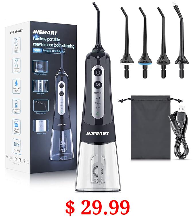 $ 29.99 Cordless Water Dental Flosser Teeth Cleaner, INSMART Professional 300ML Tank DIY Mode USB Rechargeable Dental Oral Irrigator for Home and Travel, IPX7 Waterproof 4 Modes Irrigate for Oral Care Black