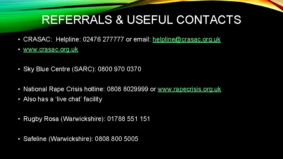 1-800-799-SAFE National Domestic Violence Hotline 1-800-787-3224 National Domestic Violence Hotline (TDD) 1-800-448-4663 National Youth Crisis Hotline U .K . Helplines 0845 790 9090 The Samaritans 0800 1111 Child line 0800 567 123 National AIDS helpline 0345 023 468 Women's Aid National Domestic Violence Helpline
