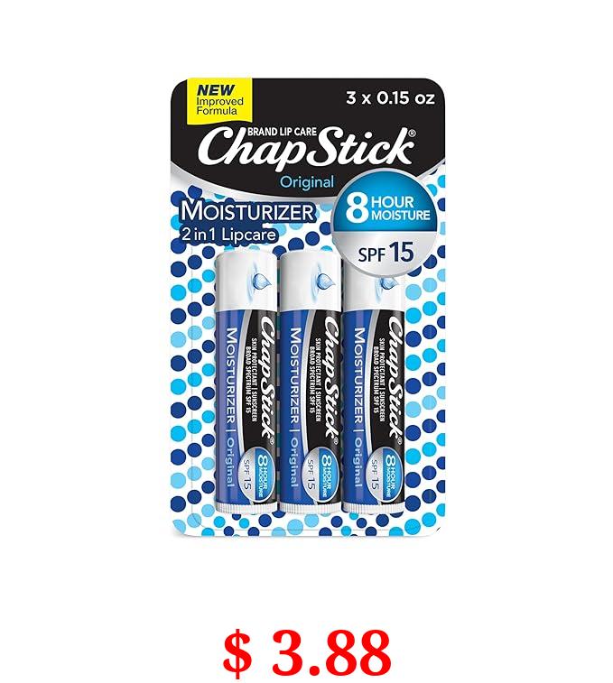 $ 3.88 ChapStick Moisturizer Original Lip Balm Tubes, SPF 15 and Skin Protectant - 0.15 Oz (Pack of 3)