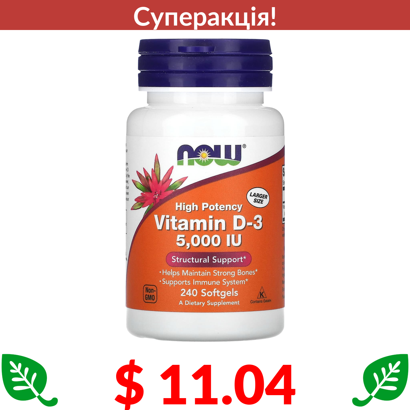 $ 11.04 Now Foods, високоефективний вітамін D3, 125 мкг (5000 МО), 240 капсул