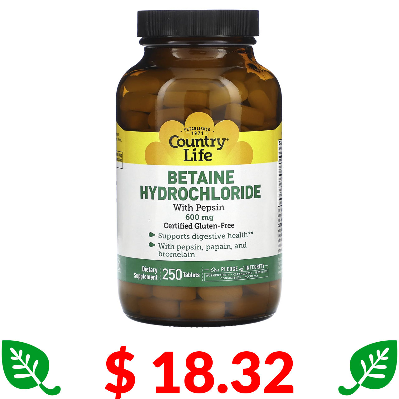 $ 18.32 Country Life, гідрохлорид бетаїну з пепсином, 600 мг, 250 таблеток
