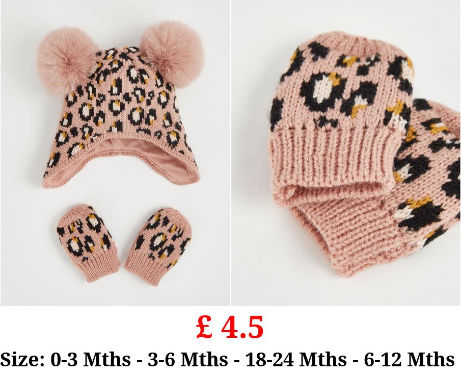 £ 4.5 Pink Animal Print Trapper Hat and Mittens Set