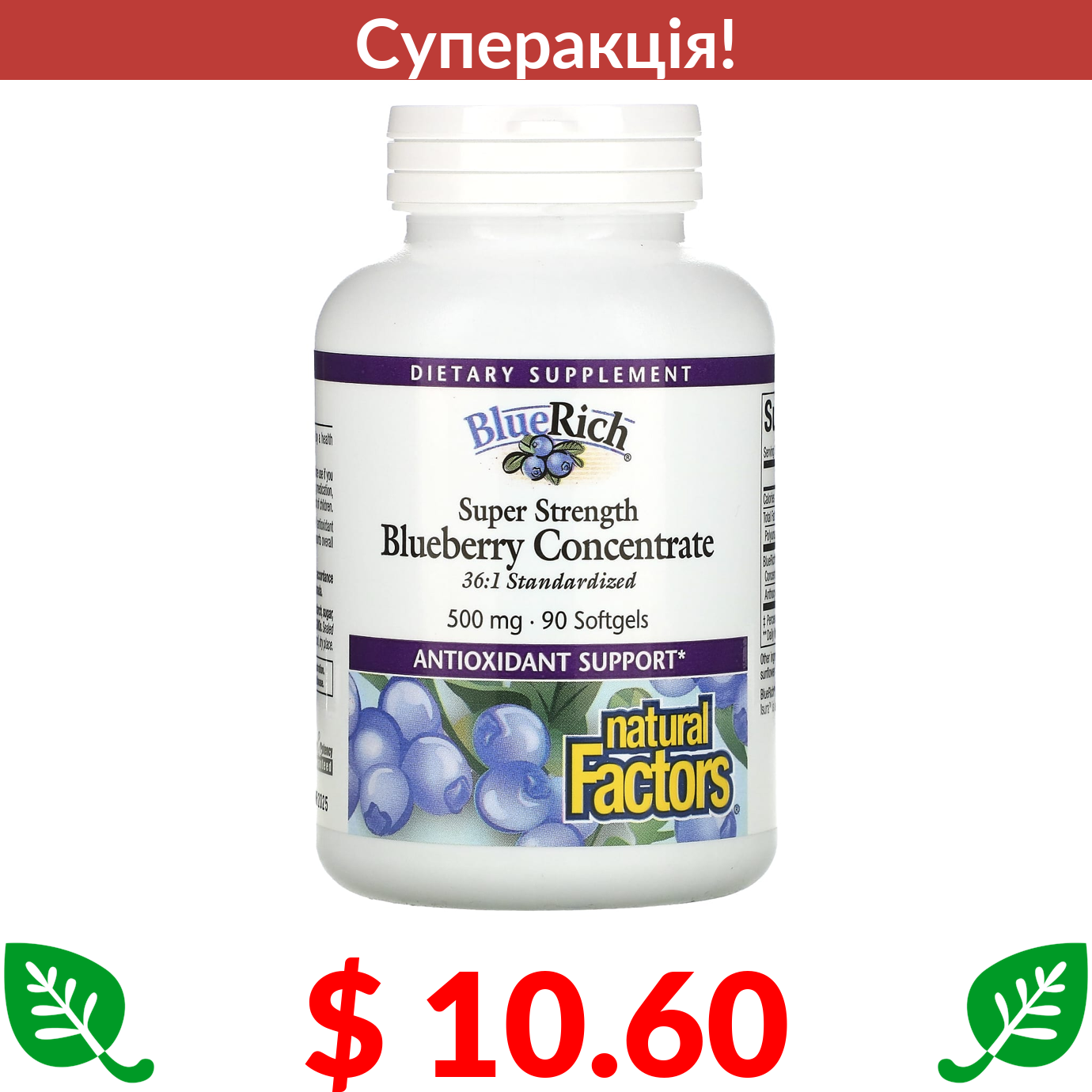 $ 10.60 Natural Factors, BlueRich, Super Strength, концентрат лохини, 500 мг, 90 капсул